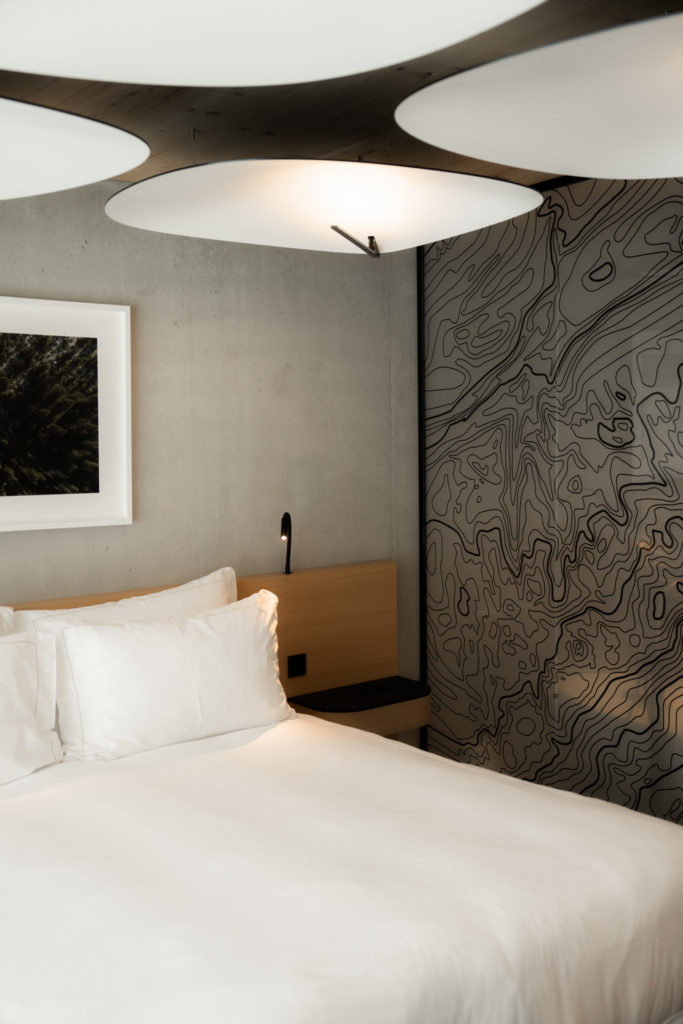 At the Hôtel des Horlogers, everything is designed to blur the boundaries between build and natural spaces, both outdoors and indoors. Combining the minimalism of concrete with the warmth of wood, the interior imagined by AU*M Pierre Minassian echoes the surrounding vegetation in a poetic way. A sleek continuous corridor leads to the rooms, both restaurants and the spa, with regular openings onto the landscape. In the bar, the large rock-like ceiling lights recall the organic shape of the nearby lake’s depths.