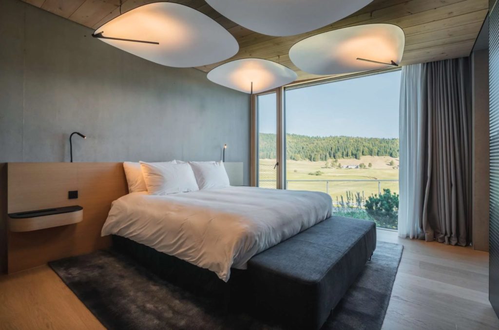 Blending into the gentle topology of the region, the imposing six-storey building features a zigzagging vegetal path leading down to the valley. In this refined setting, all rooms are facing the Risoud forest. The breathtaking panorama calls us to slow down, contemplate and connect with the peaceful rhythm of nature. Each season captures a different ambiance, from snow-capped peaks to shimmering colours.